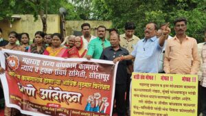 सोलापुरातील बांधकाम कामगारांना देण्यात येणारे भांडी संच देताना, ठेकेदार कामगारांकडून पैसे घेत असल्याच्या तक्रारी संघर्ष समितीकडे बांधकाम कामगारांकडून आल्याने, संघर्ष समितीच्या वतीने, पुण्यशोक अहिल्याबाई होळकर विद्यापीठ येथील भांडी वाटप केंद्रासमोर निदर्शने व धरणे आंदोलन समितीचे अध्यक्ष विष्णू कारमपुरी, उपाध्यक्ष अंगद जाधव, खजिनदार गणेश बोडू, सेक्रेटरी सोहेल शेख, महिला प्रतिनिधी वैशाली बनसोडे, रेखा आडकी यांच्या प्रमुख उपस्थितीत करण्यात आले.