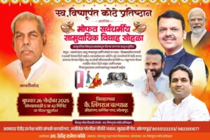 स्वर्गीय विष्णुपंत कोठे प्रतिष्ठानच्या वतीने मोफत सर्वधर्मीय सामुदायिक विवाह सोहळ्याचे आयोजन करण्यात आले आहे. यंदाचे हे दुसरे वर्ष असून बुधवार दिनांक 26 नोव्हेंबर 2025 रोजी संध्याकाळी 05 वाजून 42 मिनिटे या गोरज मुहूर्तावर हा विवाह सोहळा पार पडणार आहे. तरी नववधूवरांना शुभाशीर्वाद देण्यासाठी आपण अगत्य येण्याचे करावे असे आवाहन प्रतिष्ठानचे संस्थापक, आमदार देवेंद्र दादा कोठे यांनी केले आहे.