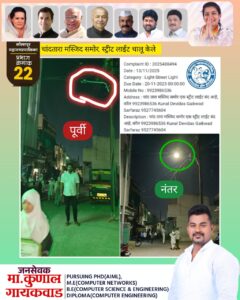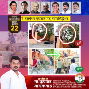 तसेच रेवण सिद्धेश्वर नगर झोपडपट्टी येथे पिण्याचे पाणी गळती दुरूस्ती करून नूतन जलवाहिनी द्वारे पाण्याची सोय करण्यात आली. हातपंप दुरुस्ती करून पाण्याची सोय केली. सेटलेंट कबड्डी ग्राउंड समोरील, सार्वजनिक शौचालय लगत हॅण्डपंप दुरुस्ती करण्यात आले. यासह बंद पडलेले पथदिवे तात्काळ दुरुस्त करून दिव्यांची सोय केली आहे. जनतेच्या मागणी अनुसार बंद पडलेले स्ट्रीट लाईट चालू करण्यात आले. जनसेवेचा वारसा घेऊन निघालेले कुणाल गायकवाड यांना प्रभागातील जनतेची साथ आवश्यक असून, कार्यशील तसेच तत्पर जनसेवकाला महापालिकेत पाठवण्याचे आवाहन या निमित्ताने केले जात आहे.