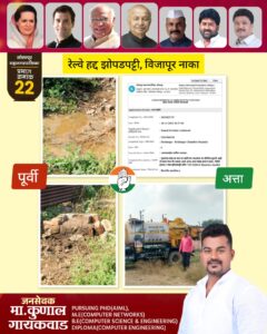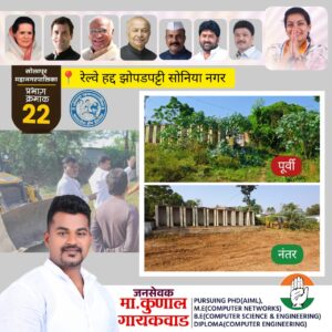 उच्चशिक्षित जनसेवक “कुणाल देविदास गायकवाड” यांनी कोणतेही पद नसताना प्रभागातील नागरिकांच्या समस्या सोडवण्याचे प्राधान्यक्रम लक्षात घेऊन सामान्या नागरिकांचा प्रश्न सोडविण्याचा सतत प्रयत्न केला. तसेच खा.प्रणिती शिंदे यांच्या निधीतून देखील विविध विकासकामे साध्य केली. प्रभाग क्रमांक २२ मध्ये युवा तसेच विद्याविभूषित तरुणांना संधी दिली पाहिजे तरच प्रभागाचा पर्यायाने नागरिकांचा चौफेर विकास होईल, असे प्रांजळ मत स्थानिकांमधून व्यक्त केले जात आहे.