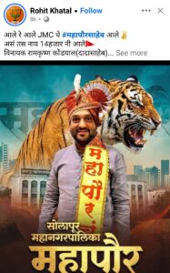 सोलापूर महानगरपालिका पंचवार्षिक सार्वत्रिक निवडणूक प्रक्रिया पूर्ण झाल्यानंतर आता नव निर्वाचित नगरसेवकांचे लक्ष महापौर पदासह स्थायी समिती सभापती, सभागृह नेते, यापदाकडे लागलेले दिसत आहे. राजकीय नेत्यांना देखील आपला कार्यकर्ता महापौर तसेच सभापतीच्या खुर्चीवर विराजमान व्हावा, असे मनोमन वाटत आहेत. मात्र भाजप पक्षातील श्रेष्ठींनी ज्या नावावर शिक्कामोर्तब करतील, तोच त्या पदाचा हकदार असणार आहे. या सगळ्या घडामोडीत सोलापूर महापालिका पुरुष प्रवर्गासाठी खुला करण्यात आला, तर विनायक कोंड्याल यांचे नाव चर्चेत येत आहे. तसे पोस्टर सोशल मीडियावर व्हायरल झाले आहेत. मात्र आरक्षण चिठ्ठ्या काढून केले जाणार आहे. चिट्ठीनुसार जे प्रवर्ग येईल त्यानुसार महापौर पद देणार असल्याचे सांगण्यात येते.