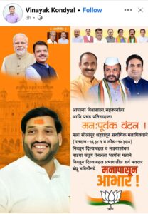मतमोजणी झाल्यानंतर विजय जल्लोष करण्यात आला. शनिवारी सकाळी निवडणूक जिंकल्यानंतर विनायक कोंड्याल यांनी देखील फेसबुक पोस्ट शेअर करत सर्व मतदारांचे आभार मानले आहेत.